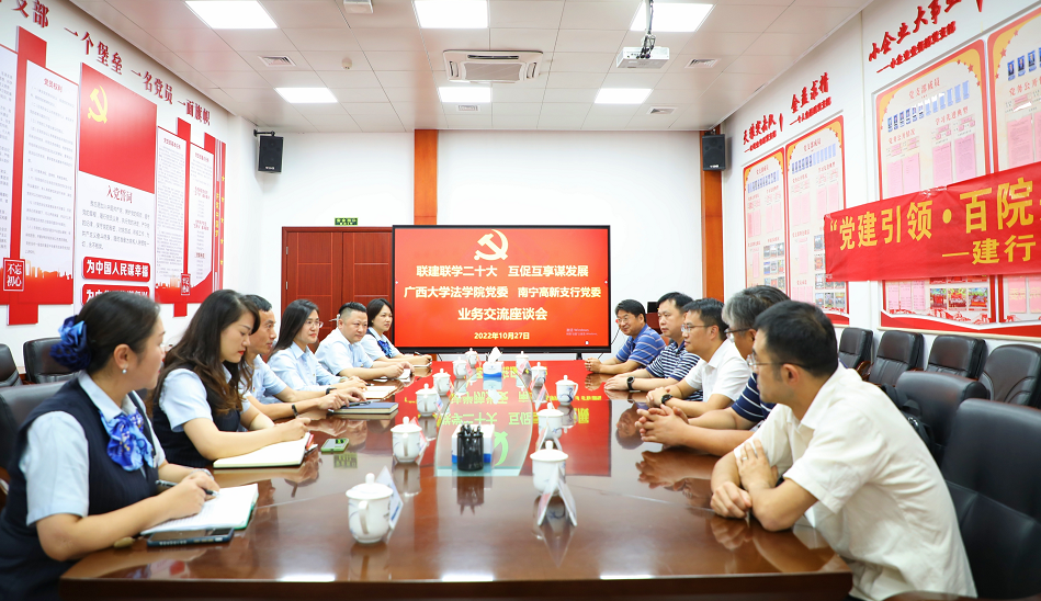 为深入学习宣传贯彻党的二十大精神,推进院企合作共建走深走实,10月27日下午,学院党政班子成员带队赴建设银行南宁高新支行开展“联建联学习贯彻党的二十大、互促互享谋发展”合作交流座谈会。