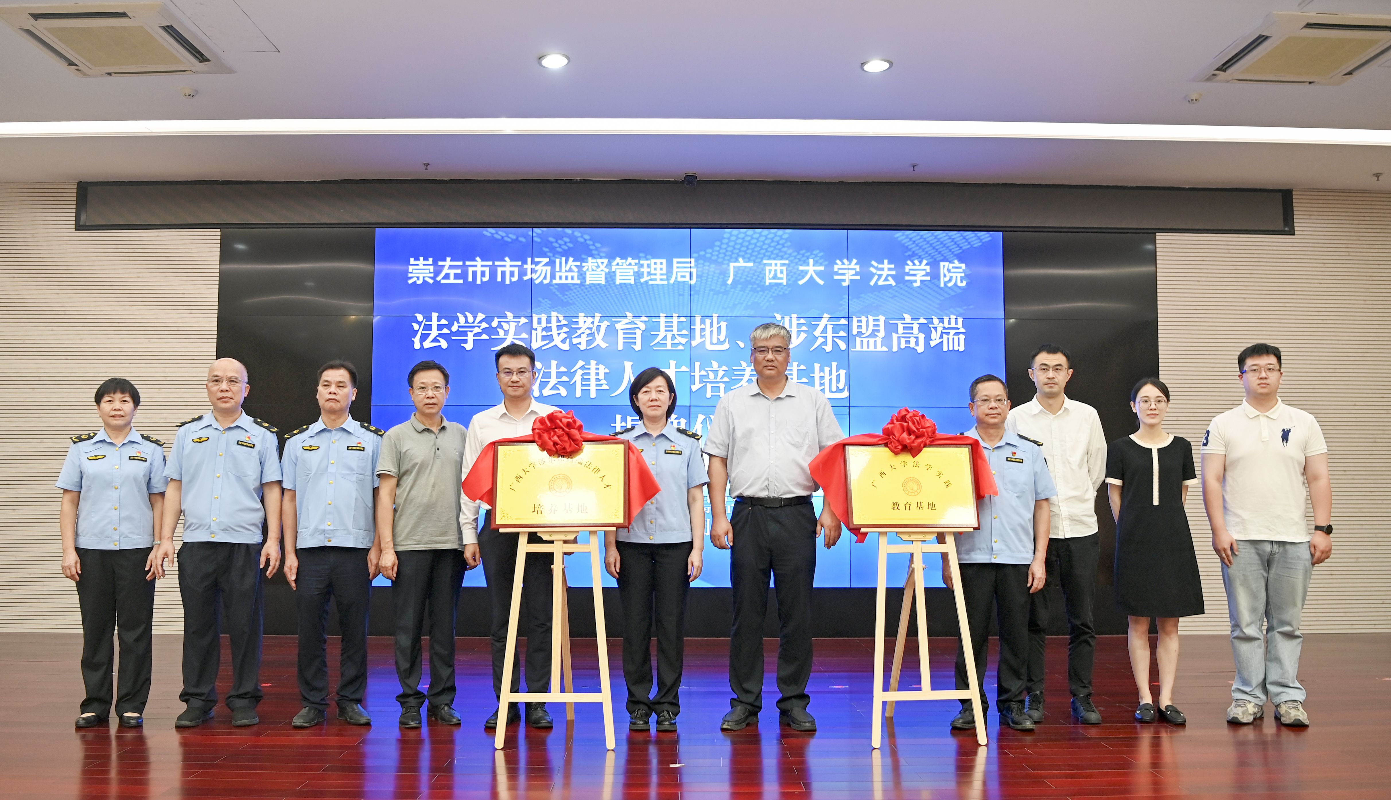 崇左市市场监督管理局、司法局相关负责人与sunbet官网领导共同为基地揭牌,在座谈中围绕协议事项内容,探讨如何发挥各自优势,在涉外法治理论和实务研究、涉外法治人才培养等领域推动深度合作。