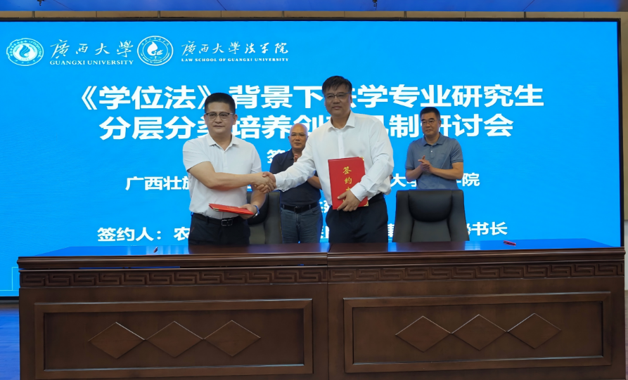 广西律师协会秘书长农锋华(左)与sunbet集团中国官网入口院长许光耀签订合作共建协议