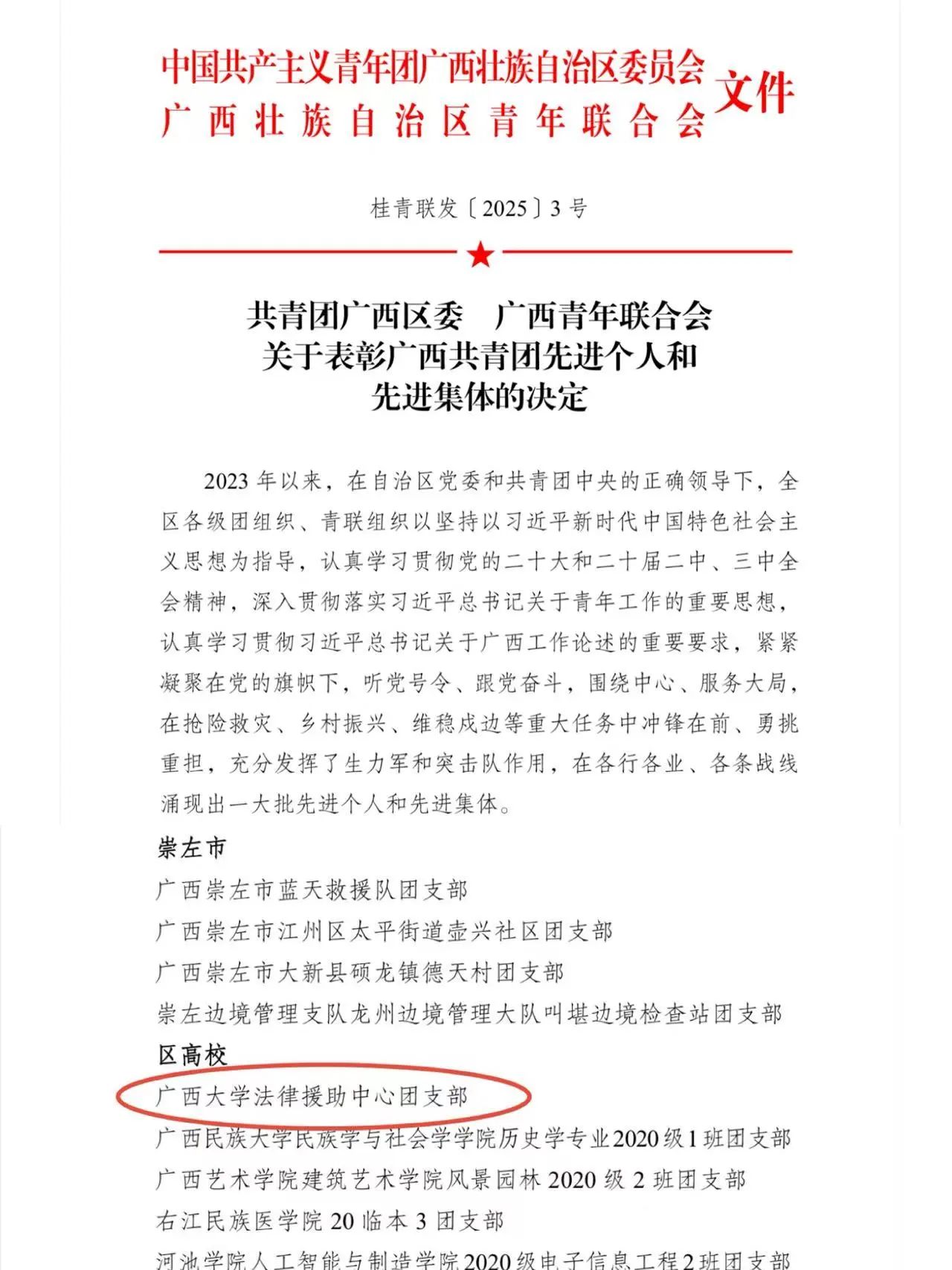 近日,共青团广西区委、广西青年联合会开展表彰工作,对一批表现优异的先进集体与个人予以表彰。“广西五四红旗团支部”“广西优秀共青团员”作为广西共青团设立的重要荣誉奖项,旨在褒奖在工作、学习领域表现突出、取得显著成绩的基层团组织与个人。sunbet集团中国官网入口法律援助中心团支部凭借志愿服务方面的突出表现,荣获“广西五四红旗团支部”称号。