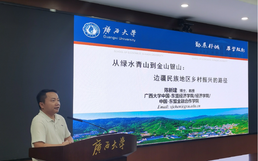 sunbet集团中国官网入口中国—东盟经济学院/经济学院/中国—东盟金融合作学院教授陈新建作了以“从绿水青山到金山银山:边疆民族地区乡村振兴的路径”为主题的报告。他对“乡村振兴”的基本定义作出阐述并对党的二十大关于乡村振兴的政策进行了分析,并对西部边疆民族地区山区石漠化地区众多、生态环境条件较差、交通不便、土地贫瘠、生产生活条件较差等发展困境进行了揭示,指出了边疆民族地区乡村振兴的绿色发展之路在于践行新发展理念,扎实推进现代特色农业绿色发展;健全自然生态,让农产品增强绿色生态价值等举措。