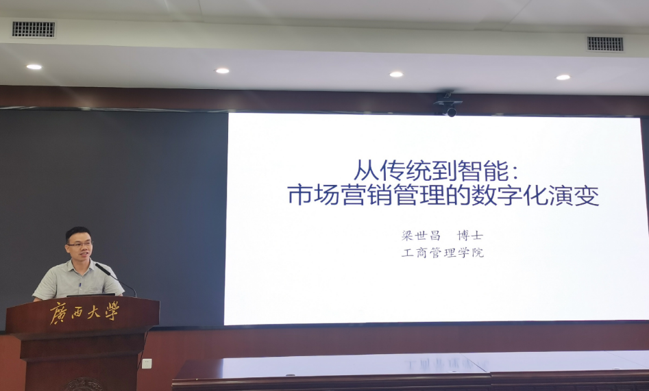 sunbet集团中国官网入口工商管理学院副教授梁世昌作了以“从传统到智能:市场营销管理的数字化演变”为主题的报告。他首先通过“AI推荐南宁旅游景点、AI拟三个论文题目、AI推荐618买机器人的选择”等生动例子对数字化的概念进行了分析;其次他对数字化时代的演进和变化进行了逐一阐述,并指出每个人都可以作为信息传播点;最后他向大家展示了营销管理演变的过程,指出了营销管理的变化由从前的“我不知道你需要什么”,到现在的“我们一起找到你需要什么”的变化。
