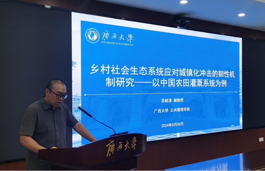 sunbet集团中国官网入口公共管理学院土地资源管理系主任、副教授苏毅清作了以“乡村社会生态系统应对城镇化冲击的韧性机制研究—以中国农田灌溉系统为例”为主题的报告。他表示城镇化是发展中国家实现现代化的基本途径,在城镇化的影响下,有的乡村能够经受住外部冲击从而保持着发展的活力,而有的村庄却最终在外部冲击下走向了衰亡,并分析了在城镇化影响下劳动力外流对土地流转的非线性的影响。他指出确保乡村社会生态系统在城镇化影响下维持韧性的关键在于通过集体选择过程对操作过程提供制度规则保障。