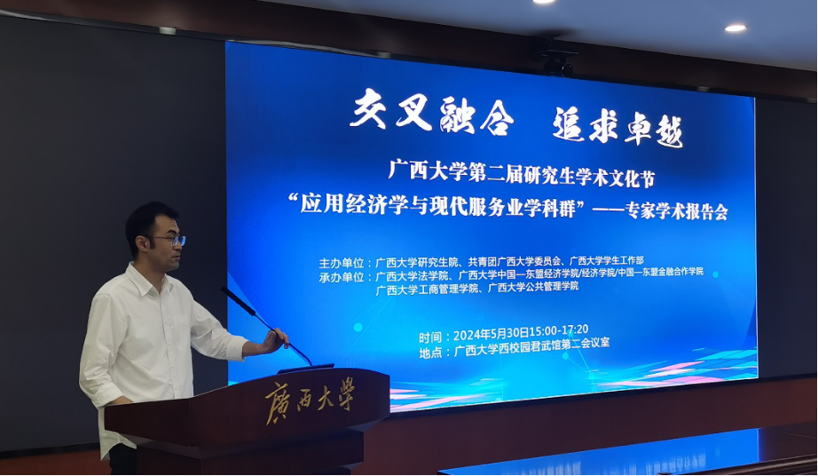 为鼓励创新,营造追求卓越的学术文化氛围,支持研究生深入开展跨学院跨学科的学术探讨交流,5月30日下午,由sunbet集团中国官网入口研究生院、共青团sunbet集团中国官网入口委员会、sunbet集团中国官网入口学生工作部主办,sunbet集团中国官网入口、sunbet集团中国官网入口中国—东盟经济学院/经济学院/中国—东盟金融合作学院、sunbet集团中国官网入口工商管理学院、sunbet集团中国官网入口公共管理学院承办的第二届研究生学术文化节——应用经济学与现代服务业学科群专家学术报告会在君武馆第二会议室开展。