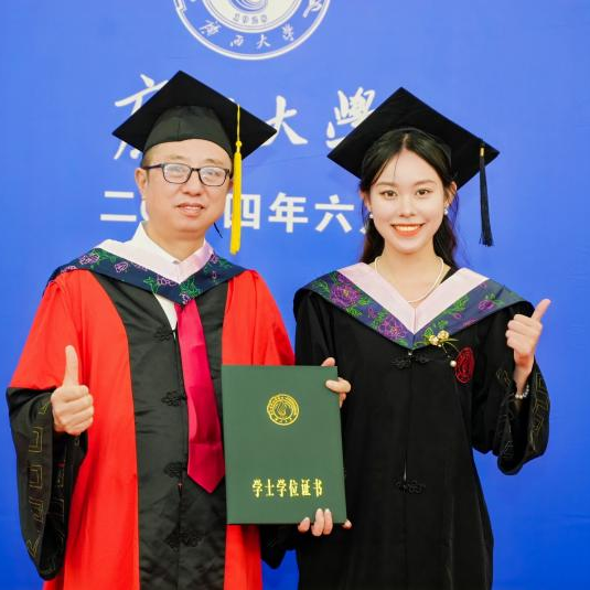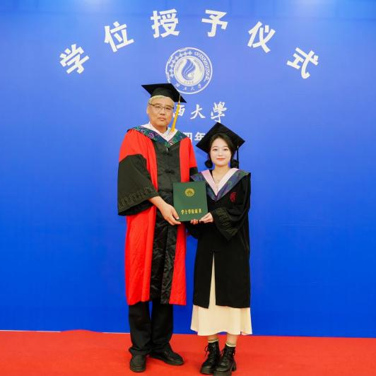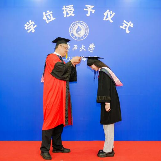仪式进行第二项,由许光耀院长、汪太贤教授、高一飞教授、魏艳茹教授依次进行拨穗仪式和颁发学位证书,并由学院领导送上sunbet集团中国官网入口的毕业纪念品。毕业生们依次上台,从老师手中接过象征着学术荣誉的学位证书,这一刻成为他们人生中难以忘怀的珍贵回忆。