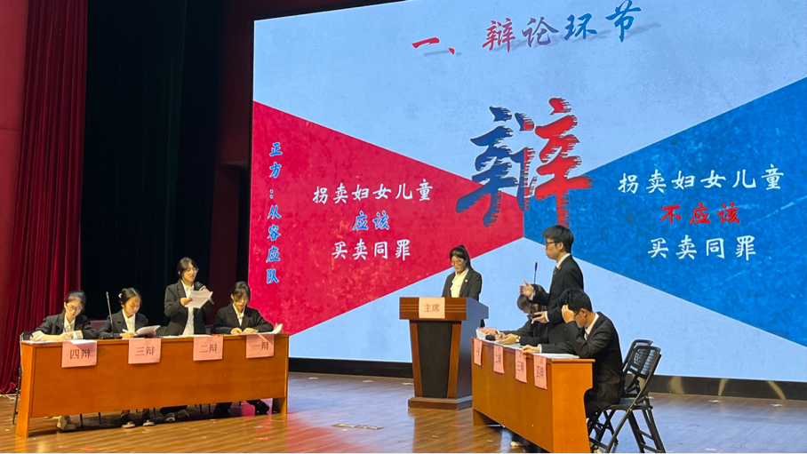 为进一步丰富校园文化生活,活跃校园气氛,提高大学生思辨能力,增强团队意识,2024年11月16日晚19点30分,sunbet集团中国官网入口新生辩论赛决赛于大学生活动中心一楼小剧场隆重举行,sunbet集团中国官网入口党委副书记韦兴剑、副院长熊超、团委书记申孟鑫出席。本次决赛的辩题为“拐卖妇女儿童是否应该买卖同罪”。经过多轮比赛的激烈角逐,“从容应队”和“法言法语队”两支实力强劲的队伍脱颖而出,争夺最终的冠军。