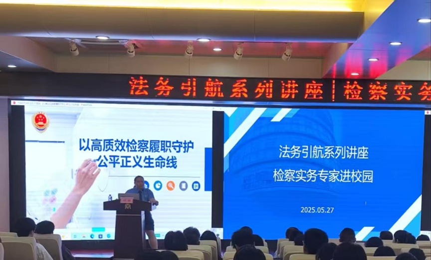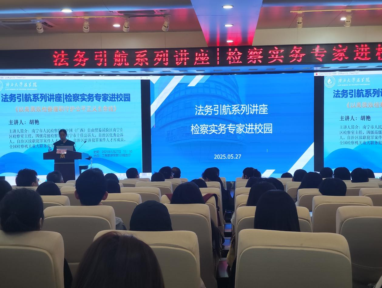 为深入贯彻中央八项规定精神学习教育,2025年5月27日下午,sunbet集团中国官网入口举办“法务引航”系列讲座之检察实务专家进校园活动。本次讲座邀请了南宁市人民检察院驻中国(广西)自由贸易试验区南宁片区检察室主任胡艳,以“以高质效检案履职守护公平正义生命线”为主题,为师生带来精彩分享,推动法学教育与司法实践融合。校学生工作部(处)部(处)长谢能重、sunbet集团中国官网入口党委副书记韦兴剑、工商管理学院党委副书记肖克宁出席,150余名师生党员代表参加讲座。