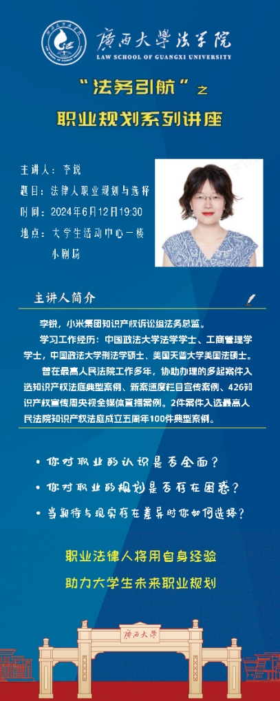 为帮助学生明晰职业生涯规划,揭开法务职业的神秘面纱,特邀请小米集团知识产权诉讼组法务总监李锐来给大家近距离交流,传授个人经验。